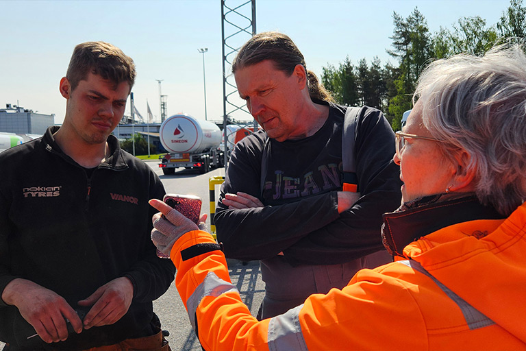 Kaikki kuljettajat, joita jututimme turvallisuuspäivän aikana 13.6.2025 Kilpilahdessa, tekevät rutiiniturvallisuustarkastuksia. He kiertävät ajoneuvon ja visuaalisesti tarkastavat renkaiden kunnon ja rengaspaineet sekä lastauksen että purkamisen yhteydessä.
